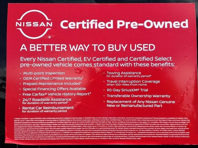 * 7 Year/100,000 Mile Limited Warranty, 24/7 Hour Roadside Assistance, Carfax Vehicle History Report, Plus 1 Year Pre-Paid Maintenance Included. Gas Powered Nissan Models Only.
